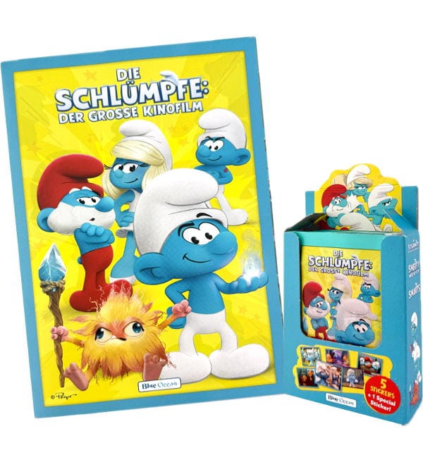 Album (wersja niemiecka) + box z 24 saszetki do kolekcji naklejki "Blue Ocean Smurfs Movie 2025". Każde saszetka zawiera 6 naklejek.