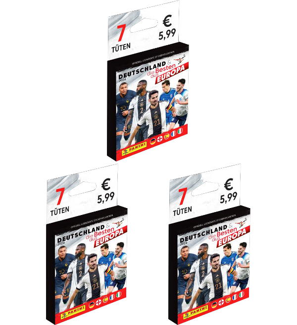 3 Eco-Blister (=21 saszetki) z kolekcji naklejki "Panini Deutschland & die Besten aus Europa 2024". Każde saszetka zawiera 6 naklejek.
