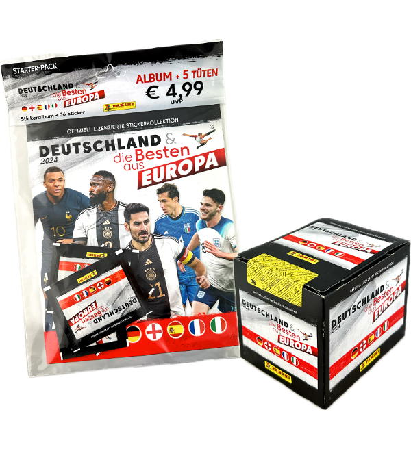 Starter-Set + 1 pudełko (=50 saszetki) z kolekcji naklejki "Panini Deutschland & die Besten aus Europa 2024". Każde saszetka zawiera 6 naklejek.