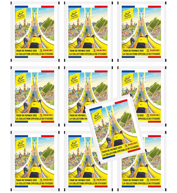 Naklejki Panini Tour de France 2025 - 10 saszetki. Każde saszetka zawiera 5 naklejek.