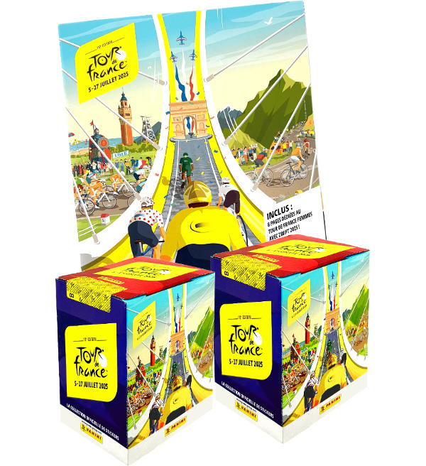 Naklejki Panini Tour de France 2025 - album + 2 pudełka (=72 saszetki). Każde saszetka zawiera 5 naklejek.