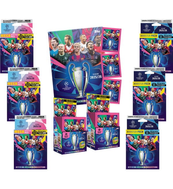 Mega-Bundle "HARDCOVER" do kolekcji naklejki "Topps Champions League 2025/2026" zawierająca:
