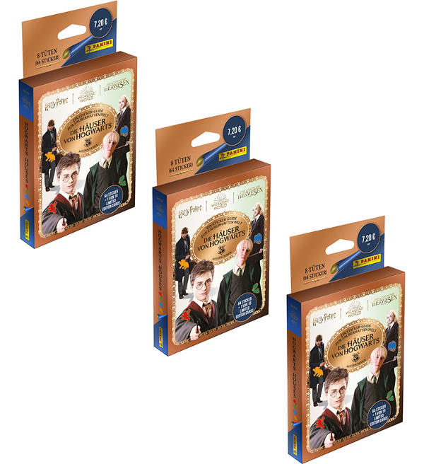 3 x Eco-Blister (=24 saszetki + 3 Limited Edition Cards) do kolekcji naklejki Panini Harry Potter Hogwarts Houses. Każde saszetka zawiera 4 duże naklejki z 8 różnymi motywami (=192 pojedyncze naklejki).