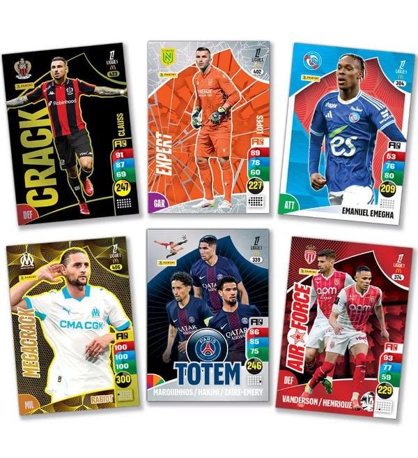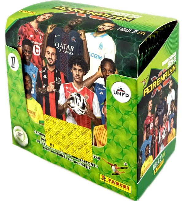 Box z 50 saszetki (=300 kart) do kolekcji kart "Panini Ligue 1 Adrenalyn XL 2025-26". Każde saszetka zawiera 6 kart.