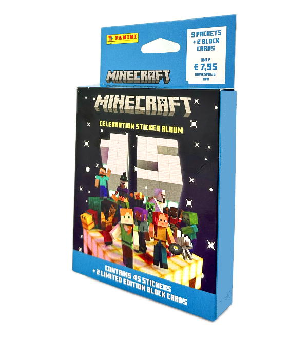Panini Minecraft Celebration (2024) Naklejki - Eco-Blister z 9 saszetki + 2 Block Cards. Każde saszetka zawiera 5 naklejek.