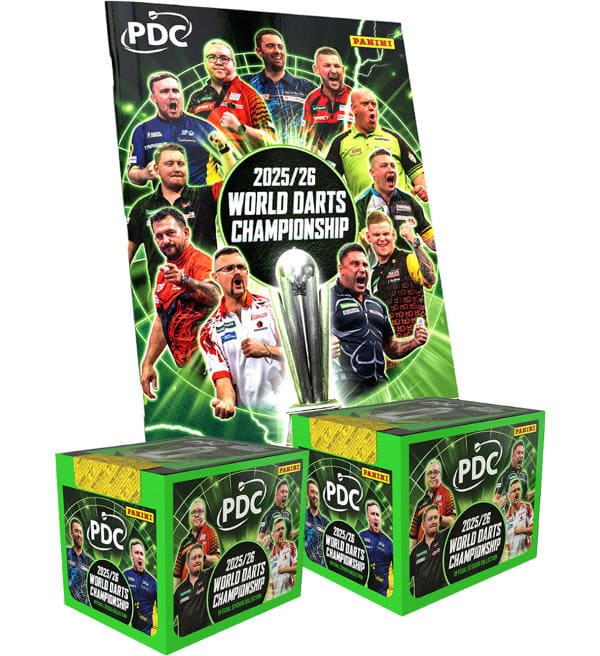 Album + 2 box (=72 saszetki) do kolekcji naklejki "Panini PDC World Darts Championship 2025/26". Każde saszetka zawiera 5 naklejek.