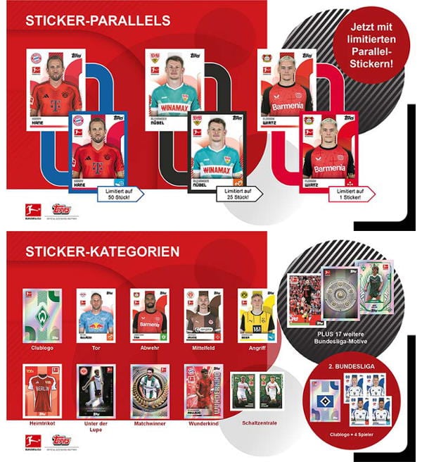 Album + 2 box (=100 saszetki) z kolekcji naklejki "Topps Bundesliga 2024/2025". Każde saszetka zawiera 7 naklejek.