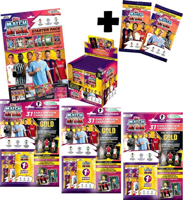 Kick-Off-Bundle + 2 Bonus Packs (w tym 2 karty z limitowanej edycji) dla kolekcji kart kolekcjonerskich Topps Champions League 2023/24 Match Attax, w tym: